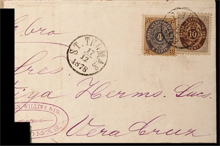 794 c 7,10 image#7, 10, 1874-76 4c Brown and dull blue and 10c blue and brown on 1878 (Dec. 17) entire from St. Thomas to Vera Cruz, tied by St. Thomas c.d.s., quite fresh and clean, a very fine 14 cents rate usage via British packet. (Image) Est. 1,500-2,000