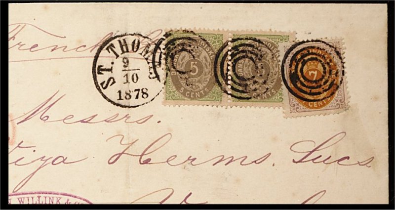 796 c Danish West Indies small collection of postal history 1846-77, comprising covers (8) and loose stamps (6, all cancelled "C51"), mainly focusing on the British Post Office, including "Colonies & Art. 12" h.s., "Paid at St. Thomas" Crowned circle, forwarding agents and spectacular 1877 envelope from St. Thomas to Hamburg bearing G.B. 1p plate 126, 3p plate 5 (4), and 10p plate 1 (2) cancelled "C51" (stamps with faults or defects), an interesting assemblage. Est. 500-750
