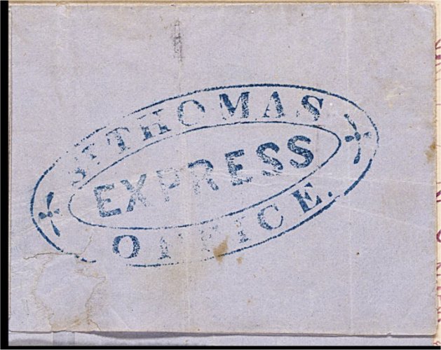 797 c imageSt. Thomas / Express / Office large double oval h.s. in blue on reverse of 1867 (Mar. 15) entire letter (lower panel at back missing) from Nantes to Santo Domingo, bearing France 1862 Empire perf. 40c orange (#27) singles (2, light horizontal crease) on front and cancelled by large figures "2602", very fine strike and late use of this handstruck marking which is unusually applied as a forwarding office mark on mail from Europe. (Image) Est. 300-400