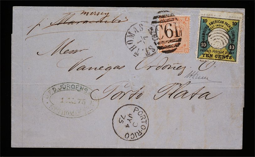 798 c imageHamburg American Packet Company (HAPAG) 1875 10c Yellow, greenish blue, and black, from the top of the sheet, on 1875 (1 July) entire from St. Thomas ("J.F.D. Jurgens & Co." merchant's cachet) to Puerto Plata, cancelled by concentric circles (mute type) h.s., showing Danish P.O. "St. Thomas" origin c.d.s. adjacent, over which Great Britain 1865 4p vermilion plate 14 (#43a) has been applied and tied by "C61" barred obliterator with matching "Porto Rico/C" (index letter inverted) c.d.s. of July 4 alongside, endorsed "p. Maracaibo" and subsequently "Mersey" since the mail was transferred from the former to the latter due to a breakdown en route, small piece of address panel with minor internal tear due to wax seal, which does not really affect the very fine appearance of this famous combination cover, a great rarity and a wonderful exhibition item;: only four HAPAG-Great Britain (British Post Office) combination covers recorded; ex-Julius Steindler; signed A. Diena. (Image) Est. 10,000-15,000