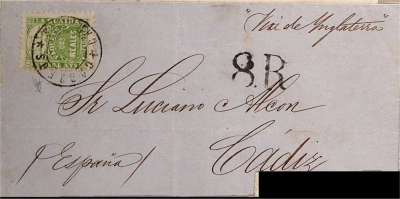 800 c imageLa Guaira-Puerto Cabello-St. Thomas 1864 zig zag roulette 2r Yellow green, on 1864 (Nov. 24) entire to Cadiz, Spain via London, cancelled by "Correos / Caracas" double ring h.s. and showing handstruck "8R" Spanish charge for external postage from La Guaira, transit and arrival backstamps, very fine and an early usage of the local printing issue; Peter Holcombe photo opinion. (Image) Est. 500-750