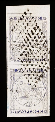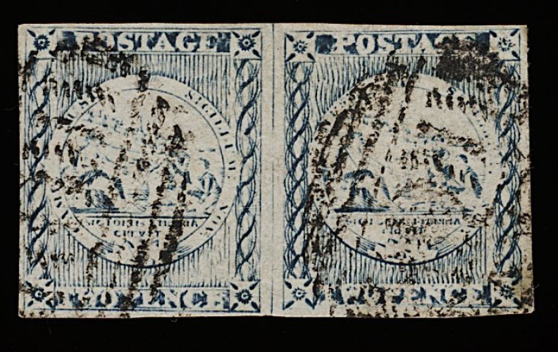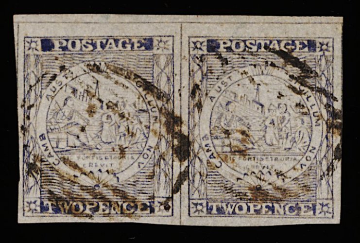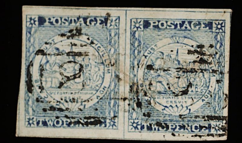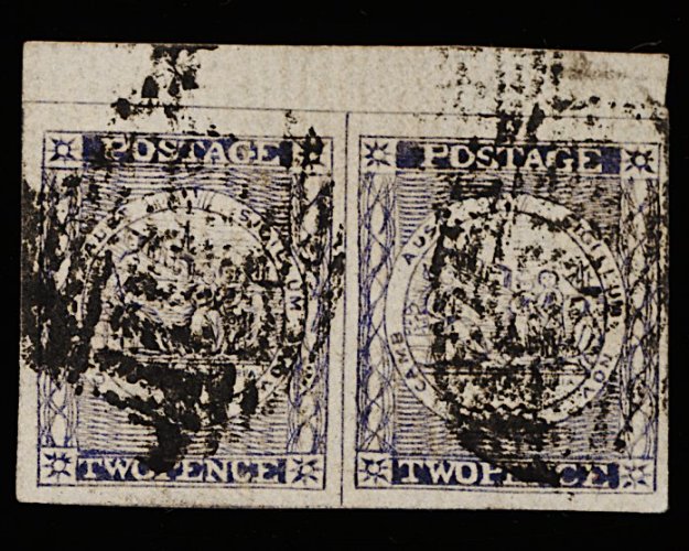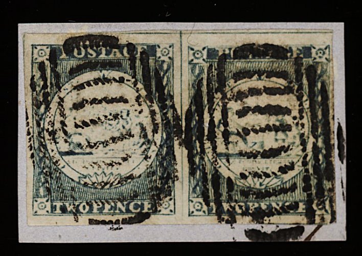 1122 O 3a image#3a, 1850 2p Grayish blue, Plate I intermediate impression, gorgeous used horizontal pair, delightful pastel-like shade, enormous margins all round, cancelled "48" (Tarcutta), extremely fine and choice; 1991 PF certificate (S.G. #16b; £550+). (Image) 700.00+