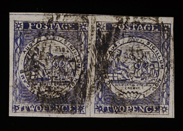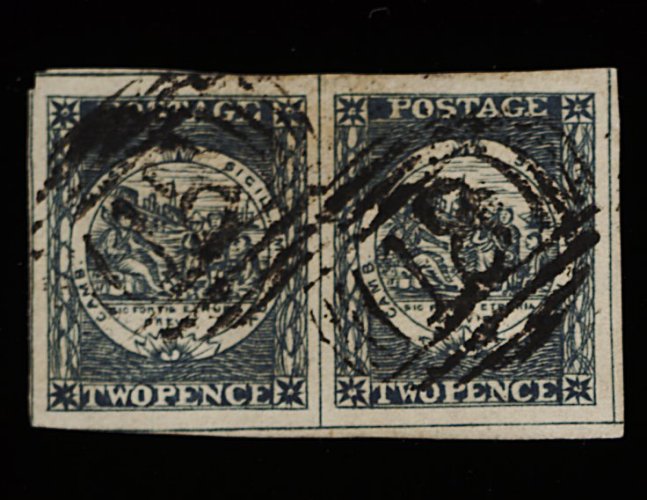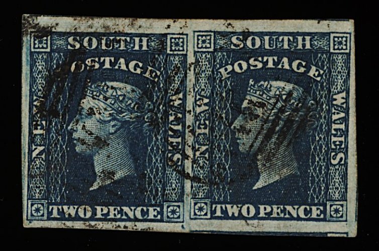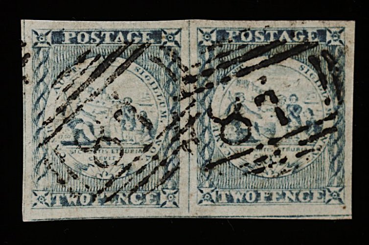 1124 O 5h image#5h, 1850 2p Gray blue, Plate II early impression incredible quality used horizontal pair, deeply etched impression displaying all the fine detail and lines of the engraving, intense dark color almost resembling indigo, enormous margins all round and clear "18" (Mudgee) cancellations, extremely fine; 1991 PF certificate (S.G. #23; £250+). (Image) 450.00+