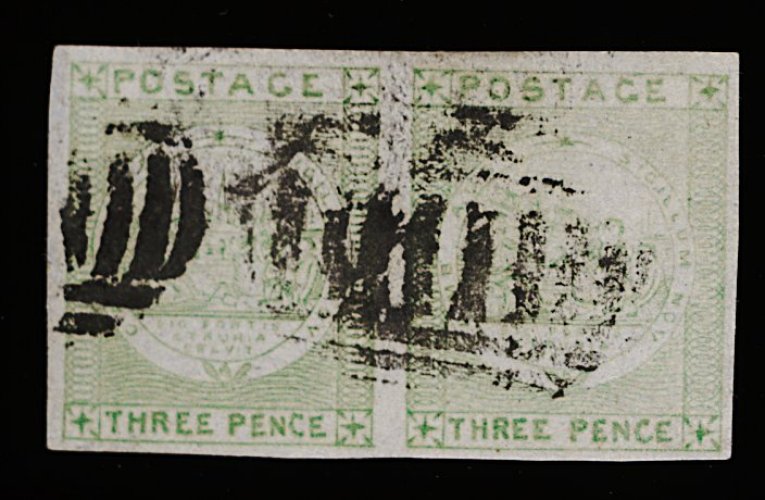1131 O 9 image#9, 1850 3p Yellow green on bluish wove paper, horizontal pair [7-8] in a pale shade, large margins all round, cancelled by barred oval obliterators, very fine (S.G. #42; £450+). (Image) 400.00+
