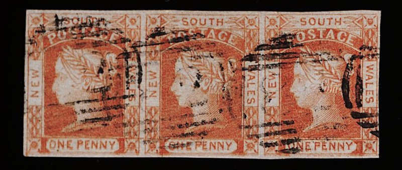 1133 O 13 image#13, 1852-55 1p Red on bluish wove paper, used horizontal strip of three in a bright vermilion shade, barred oval cancellations leaving most of Queen's profiles clear, large even margins, very fine (S.G. #47; £300+). (Image) 375.00+