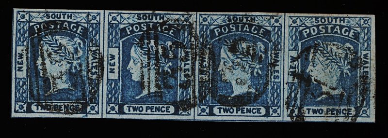 1134 O 16 image#16, 1855 2p Blue, Plate III on stout white wove paper, handsome horizontal strip of four in a deep shade with large even margins and light "38" (Goulburn) cancellation, extremely fine and an ideal multiple in terms of quality; ex-Manwood (S.G. #64; £220+). (Image) 220.00+