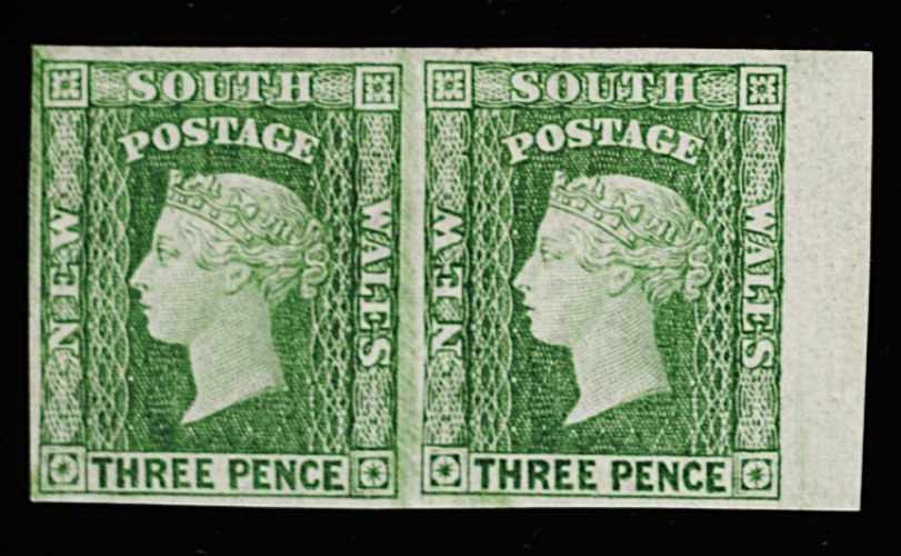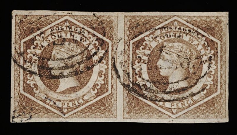 1135 O 28a image#28a, 1859 6p Grayish brown "Diadem" watermark error "8", horizontal pair in a pretty pastel-like shade with large margins all round and light "NSW" cancellation in ovals, extremely fine and choice, particularly in a multiple (S.G. #122a; £220+). (Image) 170.00+