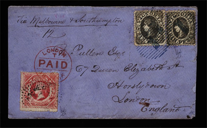 1138 c 42 image#42, 1860-63 1/- Rose, watermark double-line numeral, in combination with Victoria 1863 6p Black (#71) watermark single-lined figures (2) on 1865 (Nov. 22) envelope (opened out for display) from Moulame to London (Jan. 18, 1866) via Donilquin (Nov. 23) and Melbourne (Nov. 25), the New South Wales adhesive cancelled "59" in rays and additionally tied by crisp "London Paid" c.d.s. in red for the postage to Melbourne, while the Victoria stamps, which paid the ship rate to England, are cancelled "1" in bars in blue; since the Riverina residents of towns near the Murray River in south-central New South Wales found that letters routed through Mellbourne rather than Sydney would catch an earlier ship, thereby saving practically a week on the trip to England, they were obliged to pay double postage, since New South Wales and Victoria were independent Colonies, in order to take advantage of this expeditious service; the stamps, which are well tied by the cancellations, have at one time been lifted, probably to examine the watermarks, leaving negligible water staining; an excellent example of the rare Riverina combination cover; 1996 Holcombe certificate (S.G. #167 + #107b). (Image) Est. 1,000-1,500