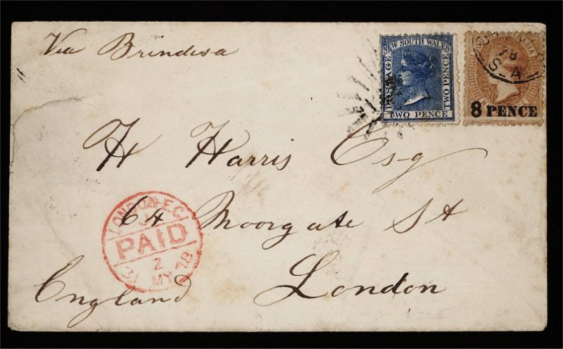 1139 c 53 image#53, 1871 2p Blue, watermark small Crown and NSW, perf. 13 cancelled by "sunburst" with matching "Wentworth / N.S.W." double arc d.s. (Apr. 12, on reverse), used in combination with South Australia 1876 8p on 9p Brown orange (#71a), cancelled by "Adelaide / G.P.O. S.A." c.d.s. (Apr. 18) on 1878 envelope (small tears at left and light age spots) to London (May 31 arrival), a rare and appealing combination cover - the New South Wales Stamp paying the internal postage (2 pence) and the South Australia adhesive the 8 pence postage overseas; 1992 B.P.A. certificate (S.G. #209 + #118). (Image) Est. 1,000-1,500
