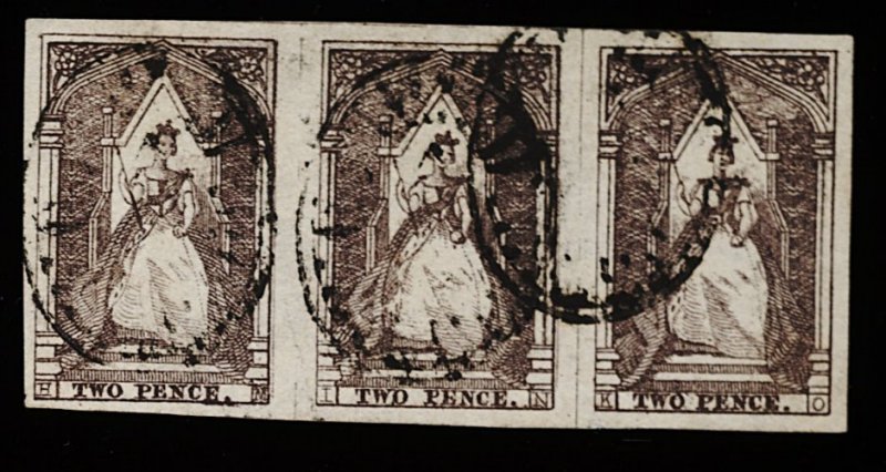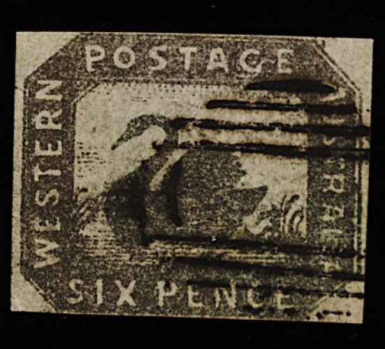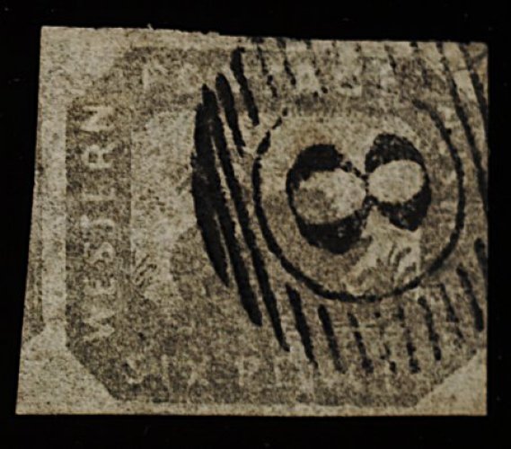 1273 O 9 image#9, 1857 6p Bronze, showing marvelous strike of an oval grid "8" cancel, margins touch at right, however margin at left shows portion of next stamp, a handsome and desirable example, fine; 1962 RPS certificate (S.G. #18; £600). (Image) 1,000.00