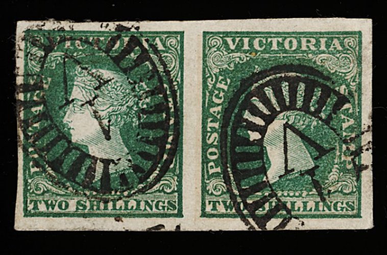 1262 O 19 image#19, 1854-58 2/- Green, typographed, imperforate, horizontal pair, rich color and neatly cancelled "1/V" amidst huge even margins, right stamp has vertical crease, otherwise very fine and a highly desirable multiple; ex-Caspary (S.G. #35; £260+). (Image) 250.00+