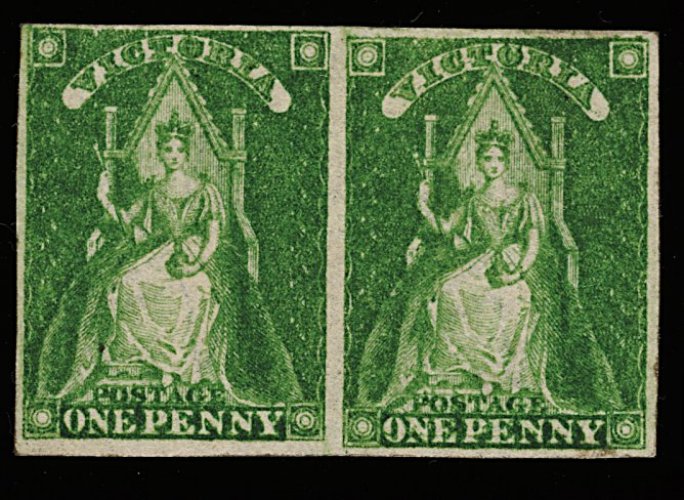 1263 og 29 image#29, 1856 1p Green "Queen on Throne", horizontal pair, vibrant color, large even margins and of a freshness belying its age, disturbed o.g., very fine; ex-Sloan (S.G. #40; £240+). (Image) 250.00+
