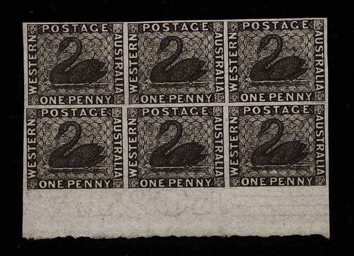 1264 ngbl 1 image#1, 1854 1p Black imperforate, an impeccable unused block of six from the bottom of the sheet, sharp prooflike impression and intense color, thin crisp paper of a freshness belying its age, full practically enormous margins all round, lower right stamp has minute pinhole of no importance, extremely fine and a remarkable multiple of this lovely classic; one of the highlights of the Chapin collection; the last appearance of this extraordinary multiple was in 1985, where it realized $5,775.00, well in excess of its then current catalog value; ex-Boker (S.G. #1; £ 4,800+). (Image) 4,500.00+