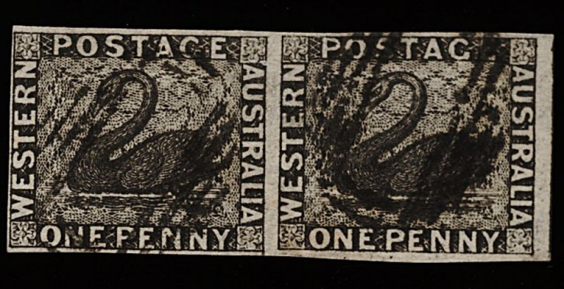 1265 O 1 image#1, 1854 1p Black imperforate, horizontal used pair, clear impression and shade, full to enormous margins showing portion of adjoining stamp, cancelled by barred oval obliterator, very fine (S.G. #1; £360+). (Image) 380.00+