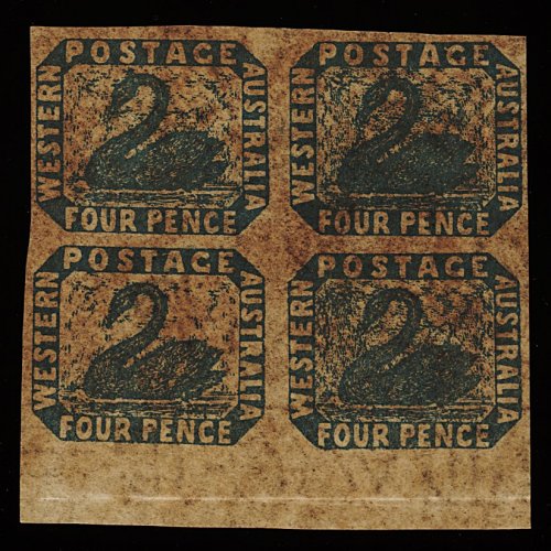 1267 ogbl 3a image#3, 1854-55 4p Blue imperforate, a very rare mint block of four from the bottom of the sheet, large margins all round, dark brown o.g. which has toned the paper, otherwise a flawless block; ex-Burrus (S.G. #3a; £900+). (Image) 1,100.00+