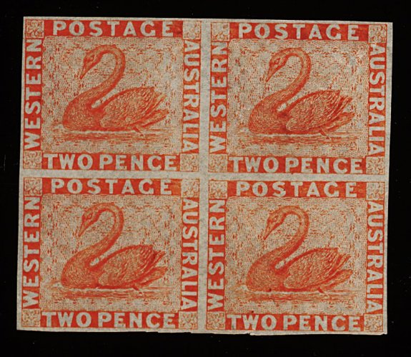 1274 ngbl 14 image#14, 1860 2p Vermillion imperforate, unused block of four, radiant color and brightness, four evenly balanced and clear margins which is highly unusual for this issue, minor paper wrinkles and a trivial margin cut do not detract from this delightful multiple, very fine (S.G. #25; £260+). (Image) 400.00+
