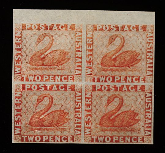 1275 ngbl 14 image#14, 1860 2p Vermilion imperforate, unused block of four from the top of the sheet, varying sharpish to slightly worn impressions between the two horizontal rows, strong color, large to enormous margins all round, a few small wrinkles, otherwise very fine and fresh (S.G. #25; £260+). (Image) 400.00+