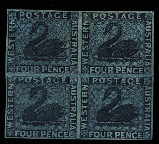 1278 ngbl 15 image#15, 1860 4p Deep blue imperforate, unused block of four, bright color and striking impression, remarkably fresh, large even margins, unobtrusive natural vertical paper fold at extreme top right, very fine and desirable multiple; 1978 PF certificate (S.G. #27; £760+). (Image) 740.00+