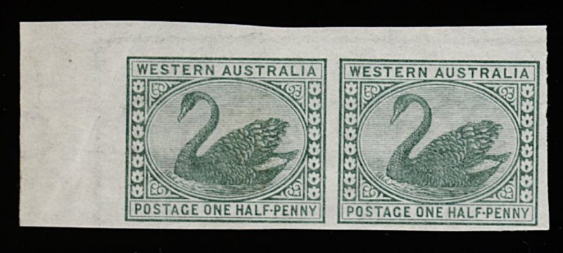 1279 nh 58a image#58a, 1885 1/2p Green, watermark Crown CA, imperforate plate proof horizontal pair from the top left corner of the sheet, large even margins, o.g., n.h., a few light gum creases, very fine and fresh (S.G. 94a; unpriced). (Image) Est. 150-200