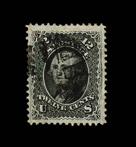 201 O 97 image#97, 12c Black, "F" grill, exceedingly well centered within enormously large margins, strong color and impression, light quartered cork postmark, extremely fine; a striking large-margined gem used example of this scarce grill; 1989 PF certificate. (Image) 225.00