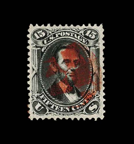 203 O 98 var. image#98 var., 15c Black, "F" grill, double grill, visually striking used example of this rare grill variety, extraordinarily well centered within considerably larger margins that typically found on this value, exceptional prooflike color and impression on bright white paper, strong clear doubling of the grill, beautifully cancelled with a stunning vivid red cancel, extremely fine; this gem is quite likely the finest existing example of this variety; 1988 and 1998 PF certificates. (Image) 330.00