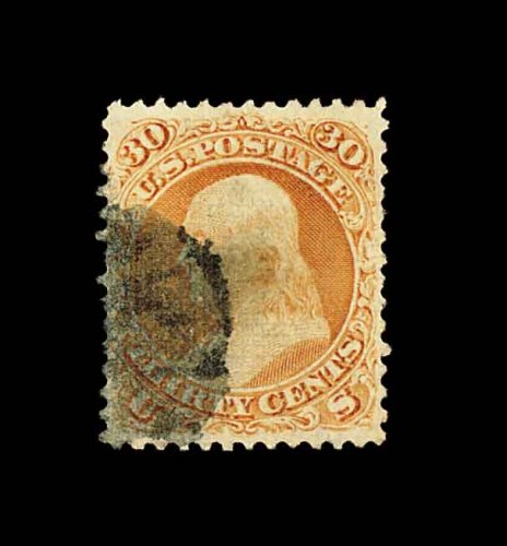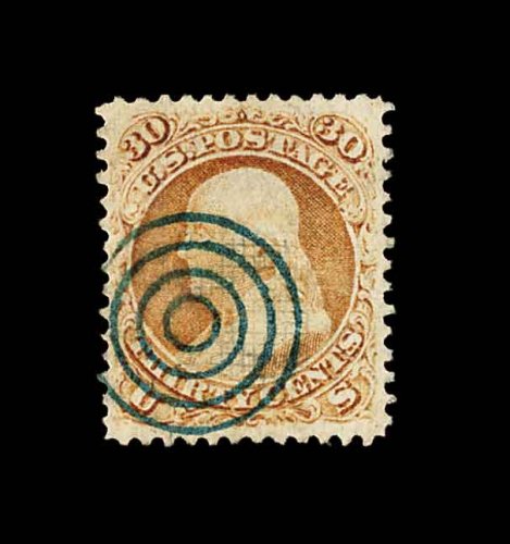 207 O 100 image#100, 30c Orange, "F" grill, a superlative used example in a condition that is almost impossible to find, featuring outstanding centering amid margins that are remarkably large for this typically tightly margined value, bright color, unusually intact and even perforations all around, superbly postmarked with a perfect strike of a four ring target cancel in deep blue, extremely fine; a highly desirable condition rarity in this gem quality; the Scott catalog states "Values for No. 100 are for copies with small margins, especially at sides. Large-margined examples sell for much more"; 1991 PF certificate. (Image) 710.00