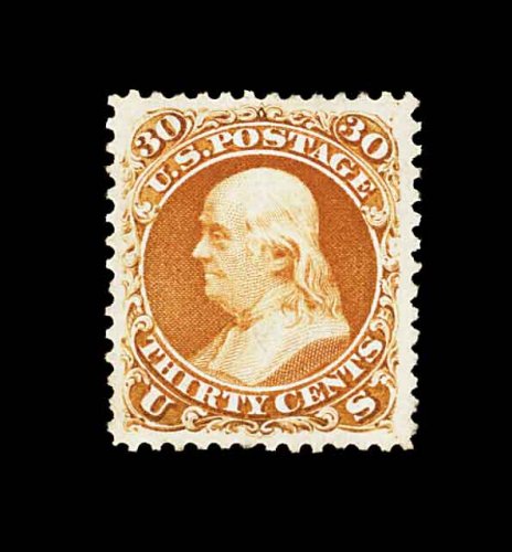218 ng 110 image#110, 30c Brownish orange re-issue, a phenomenal unused example of this re-issue rarity, possessing margins that are fabulously large and, just as remarkably, are perfectly balanced, radiant color and a prooflike impression on immaculately white paper, full and even perforations all around, superb; of the 346 issued, this is unquestionably the finest centered and margined example extant; 1991 PF certificate. (Image) 2,850.00