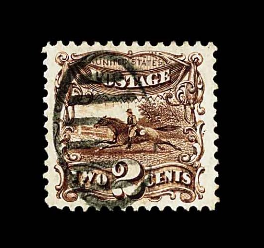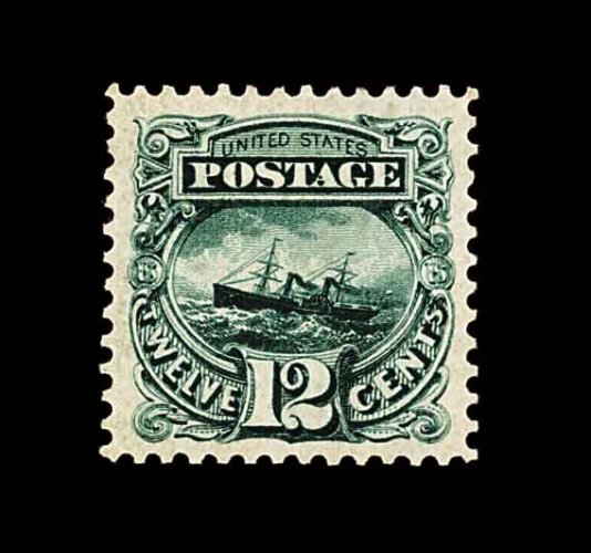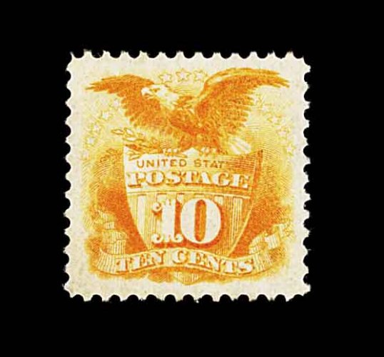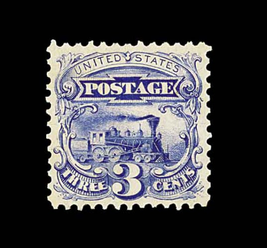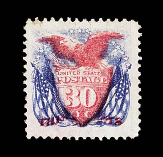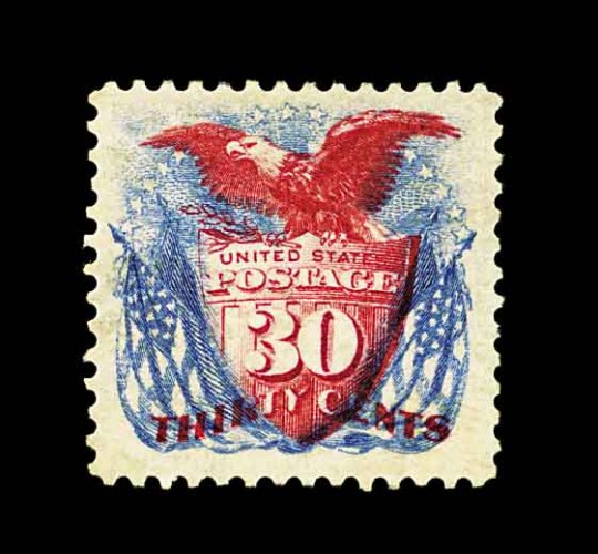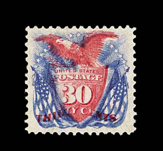 243 og 121a image#121a, 30c Blue and carmine, without grill, superlative mint example of this important 1869 Pictorial rarity, outstanding centering and margins, beautifully rich colors and unusually detailed impressions, full o.g., relatively lightly hinged, extremely fine; believed to be the finest example known of the Thirty Cent 1869 Pictorial without grill; inexplicably undercataloged by Scott, as they only give this a $1,000.00 premium over a normal mint single which, given its rarity in comparison does not accurately reflect its true value; 1985 PF certificate; ex-"Angel" Collection. (Image) 7,500.00