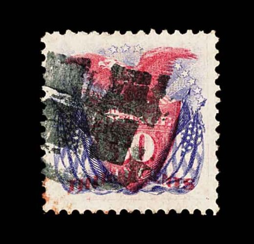 242 O 121 image#121, 30c Blue and carmine, extraordinarily well centered amid absolutely massive jumbo margins, unusually rich and bright colors on immaculate paper, crisp clear strike of a quartered cork and traces of red cancels, extremely fine; an eye-arresting gem that, along with the unused example offered in the previous lot, compete for the title of being one of the largest-margined Thirty Cent 1869 Pictorials extant; 1983 PF certificate; ex-Twigg-Smith. (Image) 550.00
