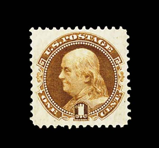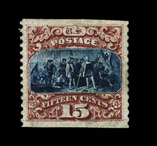 253 og 129a image#129a, 15c Brown and blue re-issue, Ty. III, imperforate horizontally, a gem mint example of this immensely rare variety, possessing outstanding centering within exceptionally wide margins, sumptuously rich colors and prooflike impressions, full o.g. which has just slightly soaked through at a few points, extremely fine; according to Jonathan W. Rose, in his outstanding handbook United States Postage Stamps of 1869, he estimates that there are only five to ten in existence, and most are typically found without gum; with such a tiny number known the catalog value does not accurately reflect its true rarity; 1995 PF certificate. (Image) 3,500.00