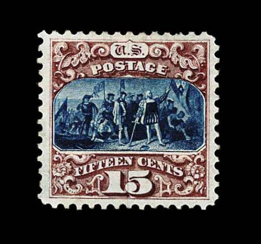 252 og 129 image#129, 15c Brown and blue re-issue, Ty. III, incredibly well centered within impressively large margins, intensely rich colors and prooflike impressions on bright paper, full o.g. that has been relatively lightly hinged, an extremely fine gem for the discriminating collector; only 1,981 issued; 1991 PF certificate. (Image) 1,900.00