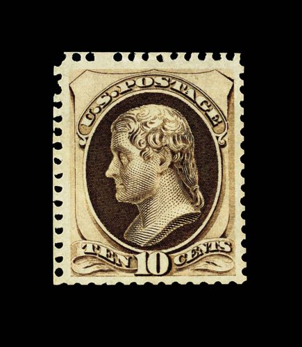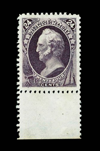 310 og 175 image#175, 24c Dull purple special printing, without gum as issued, a phenomenal example whose overall condition leaves no doubt that this is the finest Twenty Four Cent Hard Paper Special Printing in existence, being a bottom sheet-margin copy with absolutely perfect centering amid the most immense margins possible, its color is incredibly rich and its impression is remarkably detailed on bright fresh paper, intact and virtually even perforations all around, superb; an incomparable gem that ranks as one of the finest quality Special Printings in existence; this remarkable stamp was last offered at auction in 1993 (Ivy, Shreve & Mader Philatelic Auctions, Inc., October 26, 1993) where it attracted considerable bidder attention, resulting in a record realization of $11,000.00, plus the 10% buyer's premium; 1993 PF certificate. (Image) 2,750.00