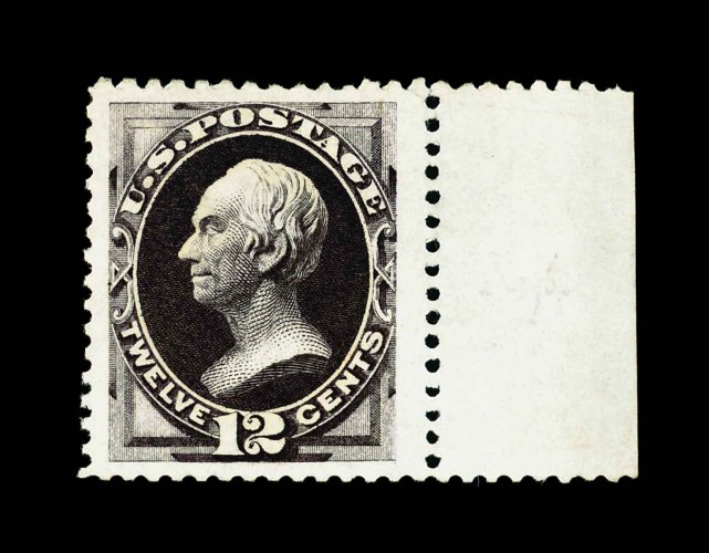 308 og 173 image#173, 12c Dark violet special printing, without gum as issued, the magnificent "Caspary" right sheet-margin example, widely regarded not only as the finest example of the Twelve Cent Hard Paper Special Printing in existence, but also considered one of the finest of all the Special Printings in terms of its overall quality, possessing spectacular centering amid margins that are unimaginably huge for any stamp, let alone a notoriously difficult Special Printing, wonderfully bright and fresh, with sumptuously rich color and a prooflike impression on immaculate paper, its perforations are completely intact and non-scissor separated (also an unheard of trait), top right corner perf. tip crease at top right so insignificant as to be not even mentioned on either accompanying certificate, still superb; one of the great condition rarities in United States philately; 1957 and 1991 PF certificates; ex-Caspary (being the right stamp from a horizontal pair). (Image) 4,250.00