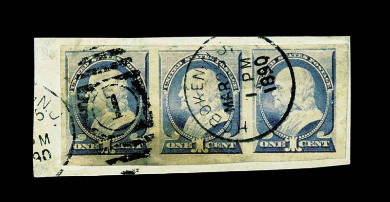 365 O 212a image#212a, 1c Ultramarine, imperforate, horizontal strip of three, large to mostly huge margins all around, tied to piece by "Hoboken, N.J./Mar 25/1890" duplex postmarks, left pair with toning at bottom otherwise very fine; an enormously rare legitimate postal usage of this rare imperforate error, potentially dispelling the theory that imperforates of this period were never sold over the counter as postage; one of only two such known postal usages of this error according to the Datz catalog, with another strip known used on cover (also from Hoboken); unlisted used in Scott; 1998 PF certificate; ex-Clarence Eagle. (Image) Est. 2,000-3,000