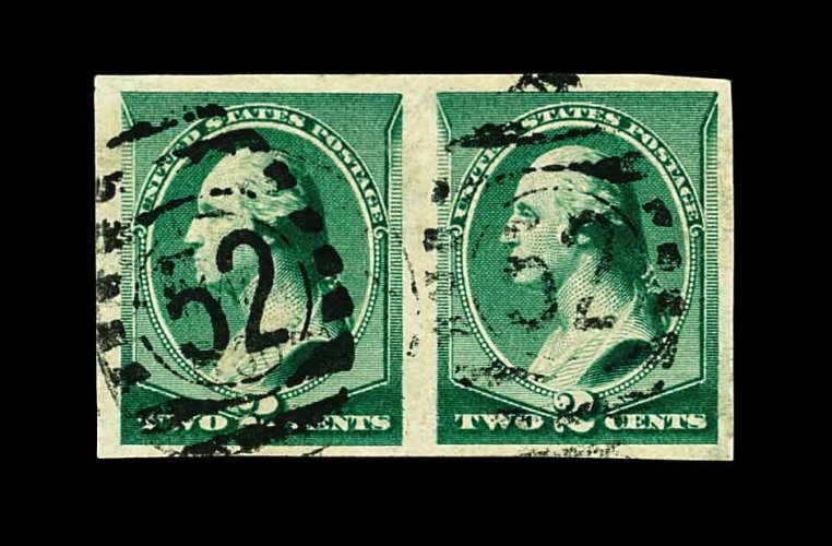367 O 213a image#213a, 2c Green, imperforate, horizontal pair, large margins all around, strong rich color, two central strikes of a "52" duplex numeral postmark, very fine; one of only two recorded used imperforate pairs of the 1887 Two Cent Green; an extremely rare and desirable error pair for either the Bank Note specialist or for the serious collector of classic U.S. errors; 1993 PF certificate. (Image) Est. 2,000-3,000