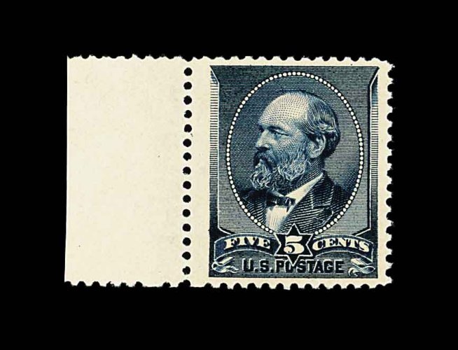 370 nh 216 image#216, 5c Indigo, impressive left sheet-margin mint single in a remarkable state of freshness, with intense prooflike color and impression on bright paper, wonderfully well centered within extraordinarily large margins, unblemished o.g., n.h., extremely fine; quite scarce in this gem never hinged condition; 1989 PF certificate for a horizontal pair, this being the left stamp. (Image) for hinged 240.00