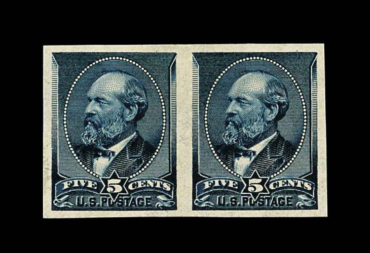 371 og 216b image#216b, 5c Indigo, imperforate, horizontal pair, a gem example of this rare imperforate, in a quality which very few of the existing pairs can compare to, featuring four perfectly balanced and large margins, unusually deep rich color, full clean o.g., relatively lightly hinged, extremely fine; especially desirable in this premium condition; 1993 PF and PSE certificates; ex-Weisman. (Image) 1,400.00
