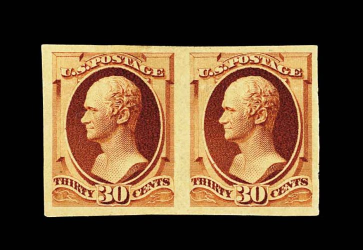 373 og 217a image#217a, 30c Orange brown, imperforate, horizontal pair, large margins all around, sumptuously rich color, full clean o.g., lightly hinged, extremely fine; a rarely seen imperforate pair in any condition, let alone in this premium quality; 1958 PF certificate. (Image) 1,750.00