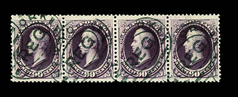 375 O 218 image#218, 90c Purple, an extraordinary quality used horizontal strip of four, with each stamp in the strip being incredibly choice, with outstanding centering and extravagantly large margins throughout, strikingly intense color and impression on fresh paper, each stamp with neatly struck "New York/Reg" double oval postmark, extremely fine; multiples of this high value are seldom found without faults, let alone in this exceptional condition; 1987 and 1990 PF certificates. (Image) 1,000.00+