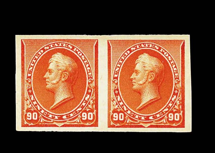 376 nh 219a-29a image#219a-29a, 1890-93 1c-90c Small Bank Notes imperforates cplt., an exceptionally choice set of horizontal pairs, being the finest assembled set we have ever offered, each pair is incredibly fresh and bright, with strong colors throughout (the 2c is the carmine shade) and all are on immaculate paper, plus each is wonderfully well margined, o.g., never hinged (except the 15c which has the barest trace of hinging and a couple of minor natural inclusions), overall an extremely fine set of these rare imperforates; each pair is accompanied by a 1993 PF certificate. (Image) 6,900.00