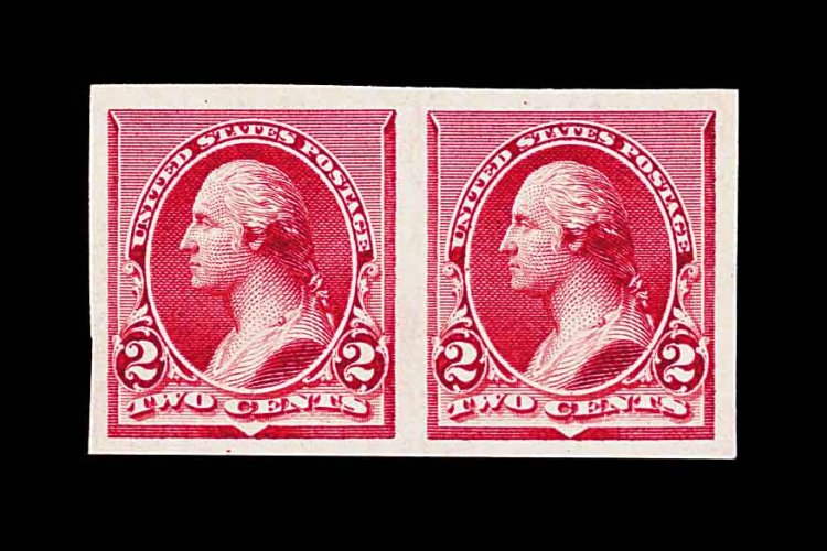 379 og 219De image#219De, 2c Lake, imperforate, select horizontal pair, unused, without gum as always, four exceptionally large margins, rich color, extremely fine. (Image) 100.00