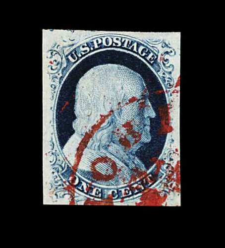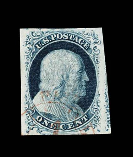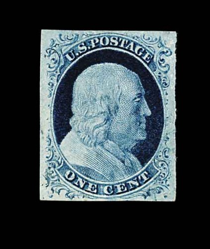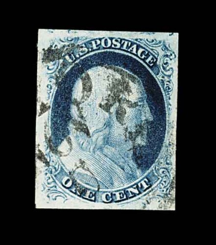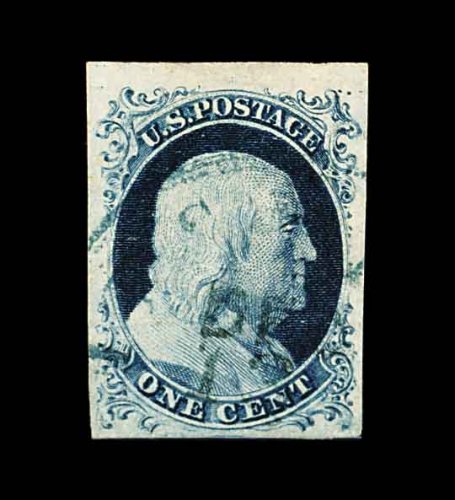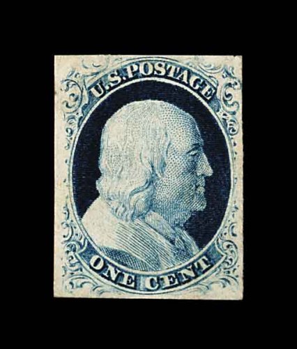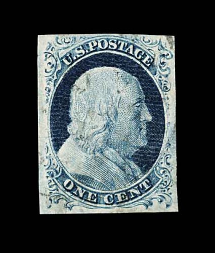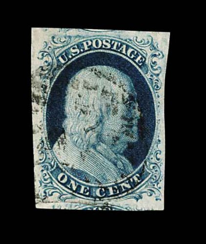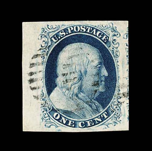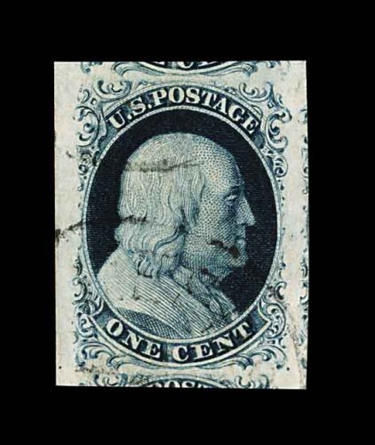 27 O 8A image#8A, 1c Blue, Ty. IIIa, position 21R4, spectacularly well margined, including an impressive sheet margin at left measuring 4 1/2mm, while the other margins are lavishly large and wonderfully well balanced, showing a bit of the adjoining stamp at right, gorgeous rich color and an especially detailed impression on bright clean paper, displaying a sizable break in the outer line at top which, as noted in the Scott catalog, commands a premium, very light and unobtrusive grid cancels, superb; a phenomenal example of the One Cent Imperforate Type IIIa; 1990 PF certificate. (Image) 975.00