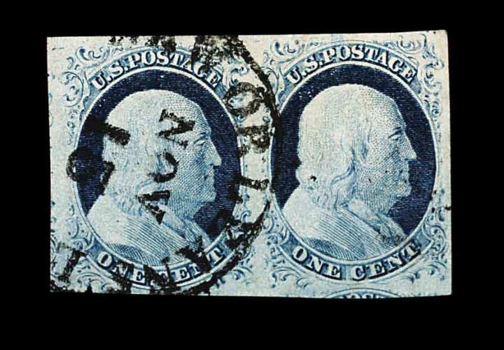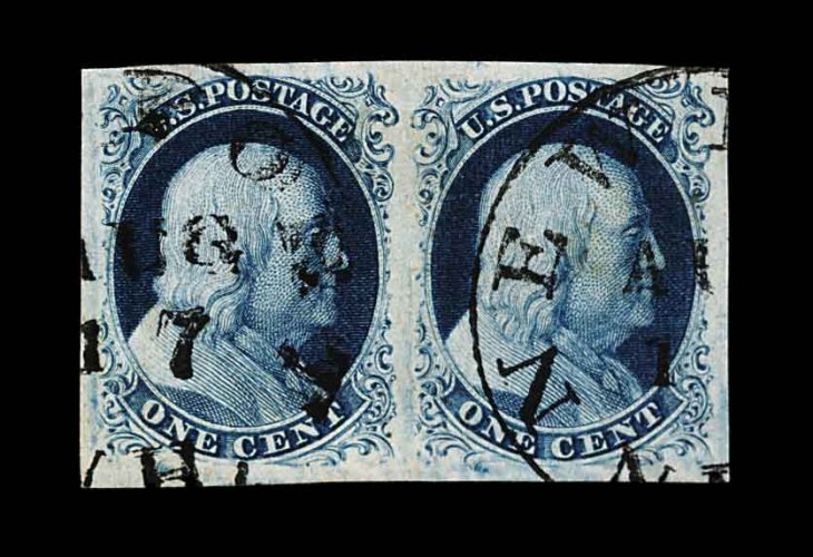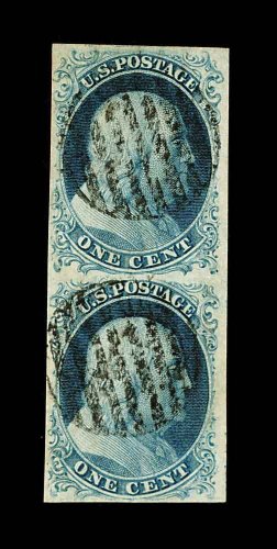 28 O 8A, 7 image#8A, 7, 1c Blue, Ty. IIIa and II combination pair, positions 43/53L1E, vertical pair, the bottom stamp being the scarce Type IIIa, showing a wide break in the top line, large even margins all around, bright early color and a highly detailed impression, light central strike of a black grid postmark on each stamp, extremely fine; a lovely example of this scarce combination pair; 1987 PF certificate; ex-Meyersburg and Koppersmith. (Image) 1,150.00