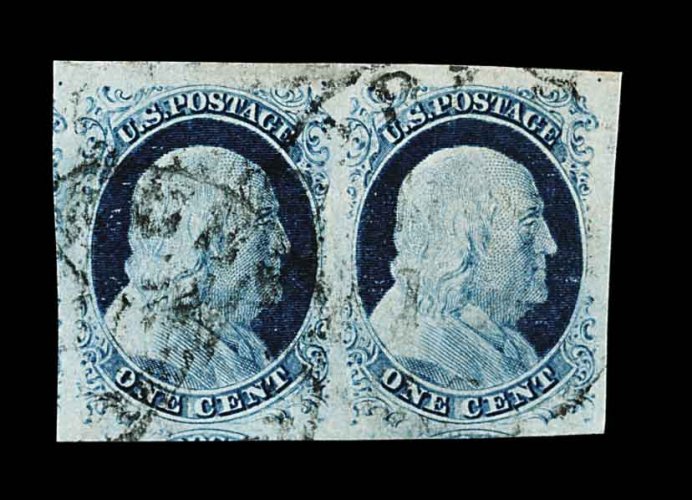 24 O 7, 9 image#7, 9, 1c Blue, Ty. II and IV combination pair, positions 3-4R1L, horizontal pair, position 4R1L being the sole position on Plate 1 Late that was not recut, incredibly well margined, with extravagantly wide margins all around, with portions of adjoining stamps showing at left and at bottom, deep rich color and impression on bright paper, bold New Orleans c.d.s., extremely fine; a gem combination pair of considerable rarity, whose catalog value does not accurately reflect its true value, especially when one considers that only one position out of 200 on the sheet produced this unusual variety, and yet the Scott catalog only gives this a two times premium over a normal stamp; 1984 PF certificate; ex-Koppersmith. (Image) 650.00+