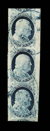 37 O 9 image#9, 1c Blue, Ty. IV, a vertical strip of three in the finest condition imaginable, boasting gigantic margins all around, including a very large sheet margin at right, and its other margins are equally as impressive and balanced, showing portions of adjoining stamps all around (five in all), bright color on fresh paper, very light and unobtrusive strikes of a blue town c.d.s., simply superb; a magnificent quality multiple of the recut One Cent Blue imperforate; 1987 PF certificate for a strip of four from which this was taken. (Image) 425.00
