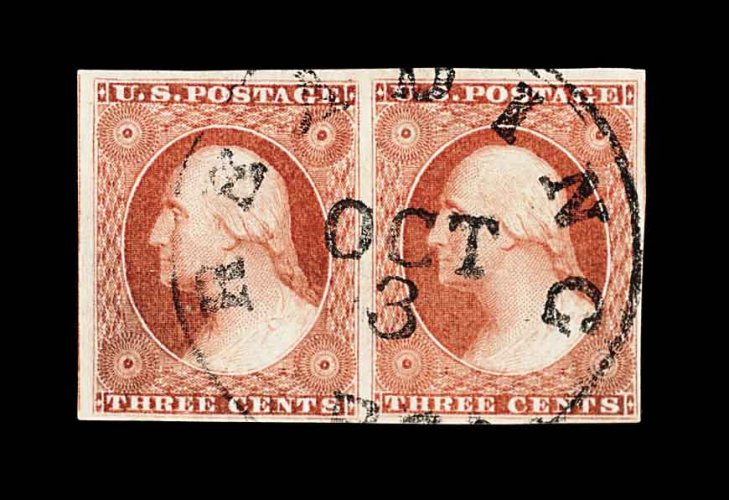 39 O 10 image#10, 3c Orange brown, horizontal pair, exceptionally large margins all around, unusually bright orange brown color, crisp impression. neat central "Reading, Pa./Oct 3" c.d.s., extremely fine and quite scarce thus; 1984 PF certificate. (Image) 375.00