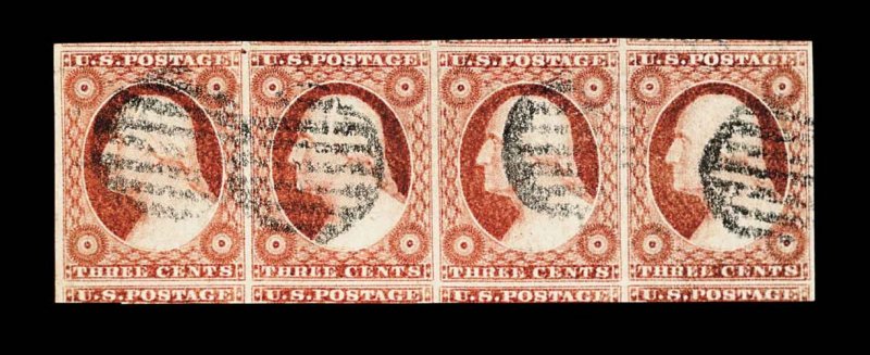 40 O 11 image#11, 3c Dull red, positions 46-49R3, horizontal strip of four, spectacularly well margined all around, boasting portions of all four adjoining stamps at top and significant portions of all four stamps at bottom, with full "U.S. Postage" label showing, margins at sides large as well, intensely rich color and a highly detailed impression on bright crisp paper, light strikes of neat grid cancels, superb; the finest quality strip of the Three Cent Dull Red we have ever encountered; 2000 PF certificate. (Image) Est. 500-750