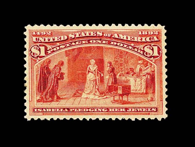 421 og 241 image#241, $1.00 Columbian, mathematically precise centering amid uncharacteristically large margins, gorgeous intense and radiant color, strong clean impression, full pristine o.g. that has been very lightly hinged, an extremely fine gem; in our opinion, which is shared by others, the One Dollar Columbian is the most difficult of all the dollar value Columbians to obtain in premium original gum condition; 1990 PF certificate. (Image) 1,400.00