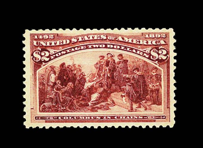 422 og 242 image#242, $2.00 Columbian, virtually perfect centering within considerably larger margins than typically found on this value, plus its color is more intense and its impression more deeply etched than usual, bright fresh paper, full clean o.g., lightly hinged, extremely fine; a choice original gum Two Dollar Columbian; 1990 PF certificate. (Image) 1,450.00
