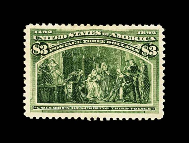 424 nh 243a image#243a, $3.00 Columbian, the olive green shade, a phenomenal right sheet-margin mint example that is in the finest attainable quality, with every physical characteristic of this stamp being sheer perfection, including mathematically precise centering within lavishly large margins, spectacularly rich color in a stunning deep olive green shade, prooflike impression on bright fresh paper, even its perforations are remarkably uniform and intact, the reverse boasts full original gum that is never hinged, superb; this incomparable never hinged Three Dollar Columbian may very well be the finest in existence; (Image) 5,250.00